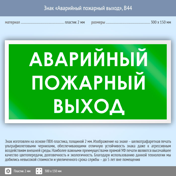 Знак «Аварийный пожарный выход», B44 (пластик, 300х150 мм) в Великом Новгороде купить