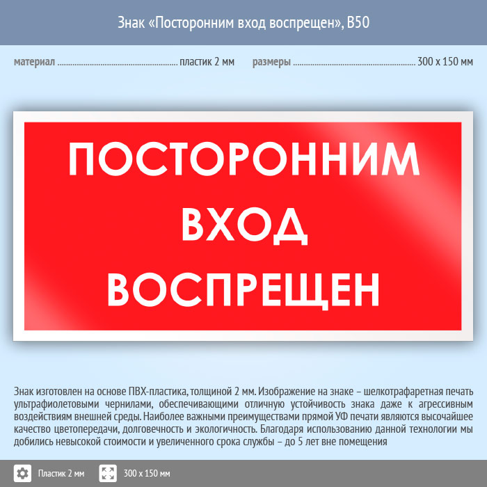 Знак «Посторонним вход воспрещен», B50 (пластик, 300х150 мм) в Великом Новгороде купить