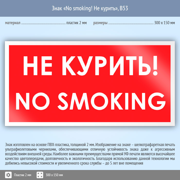 Знак «No smoking! Не курить», B53 (пластик, 300х150 мм) в Великом Новгороде купить