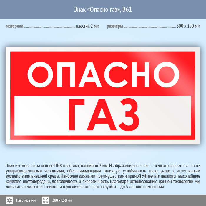 Знак «Опасно газ», B61 (пластик, 300х150 мм) в Великом Новгороде купить