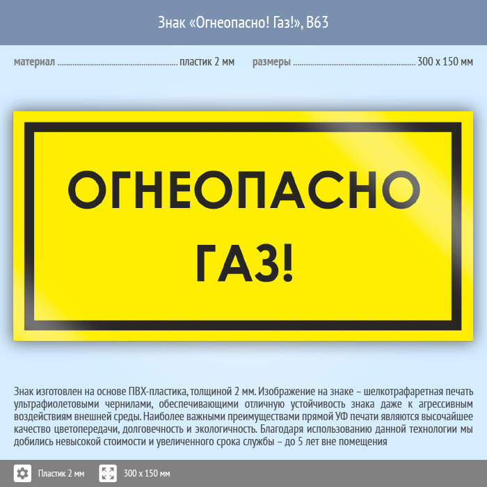 Знак «Огнеопасно! Газ!», B63 (пластик, 300х150 мм) в Великом Новгороде купить
