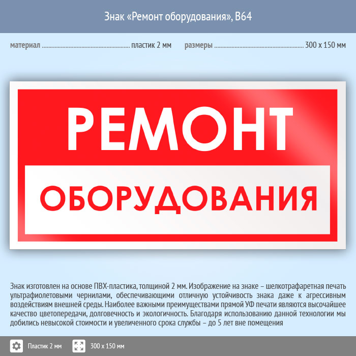 Знак «Ремонт оборудования», B64 (пластик, 300х150 мм) в Великом Новгороде купить