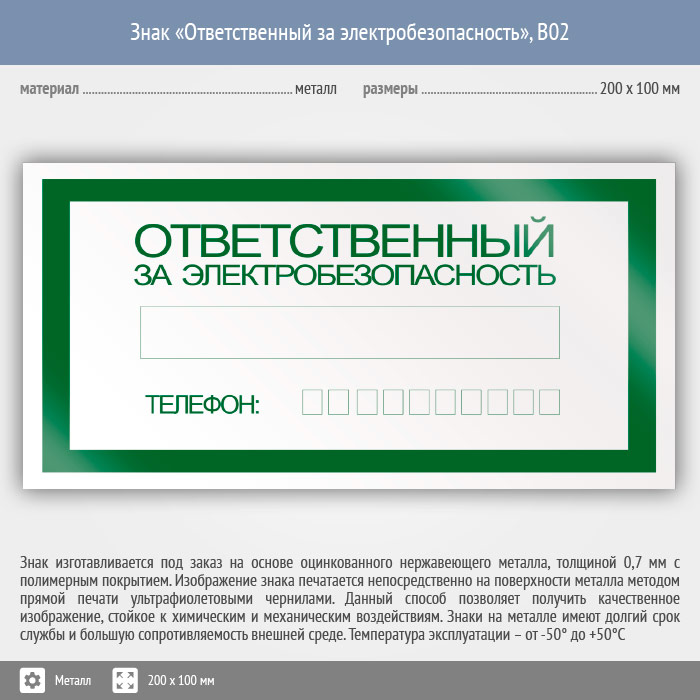 Знак «Ответственный за электробезопасность», B02 (металл, 200х100 мм) в Великом Новгороде купить