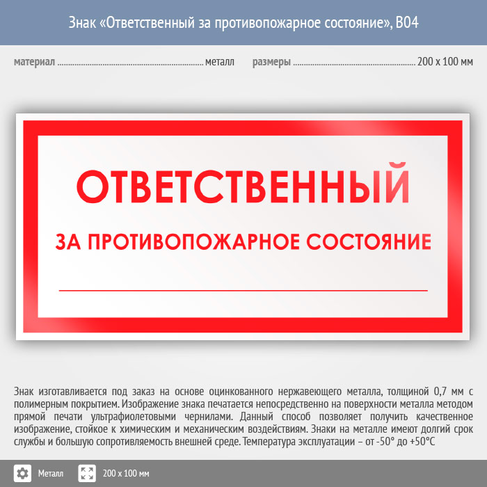 Знак «Ответственный за противопожарное состояние», B04 (металл, 200х100 мм) в Великом Новгороде купить