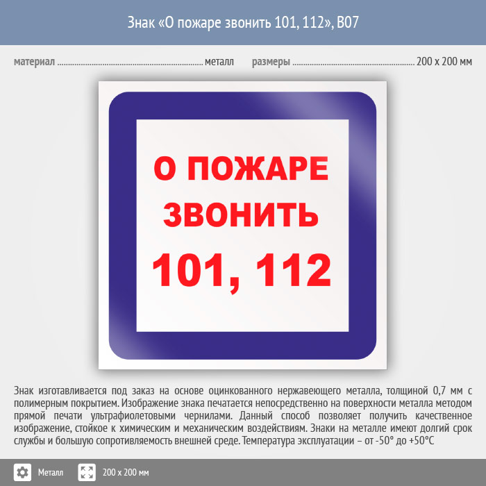 Знак «О пожаре звонить 101, 112», B07 (металл, 200х200 мм) в Великом Новгороде купить