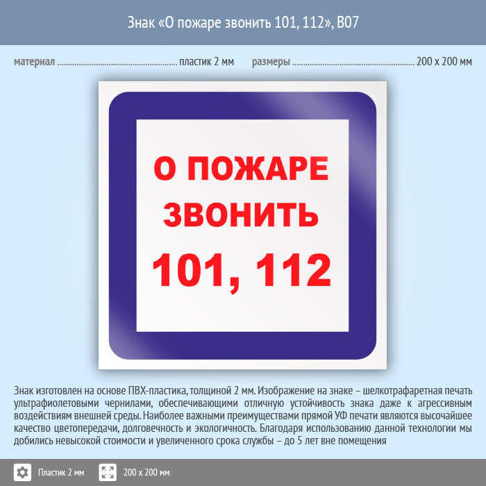 Знак «О пожаре звонить 101, 112», B07 (пластик, 200х200 мм) в Великом Новгороде купить