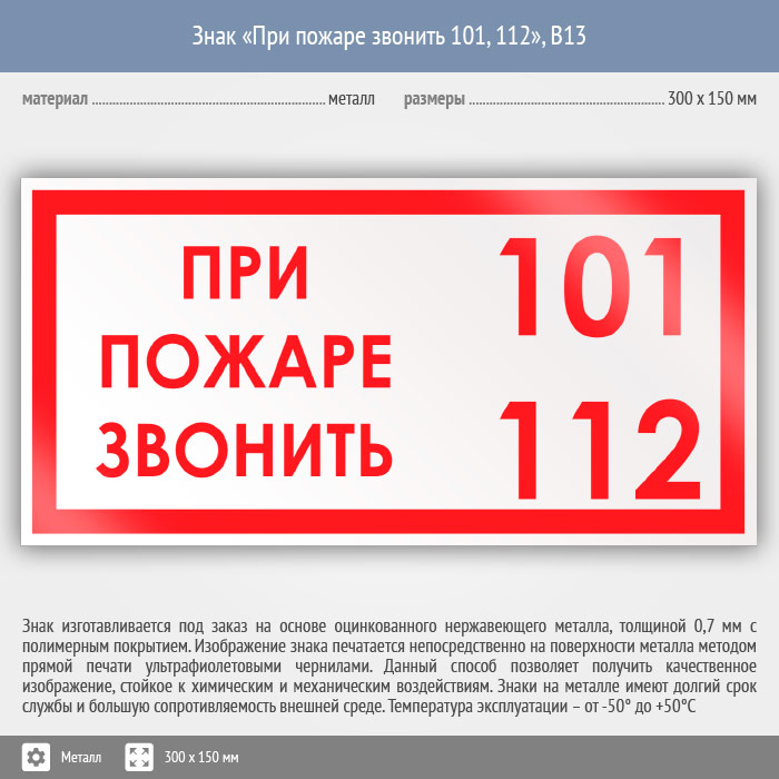Знак «При пожаре звонить 101, 112», B13 (металл, 300х150 мм) в Великом Новгороде купить