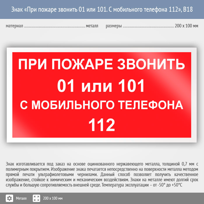 Знак «При пожаре звонить 01 или 101. С мобильного телефона 112», B18 (металл, 200х100 мм) в Великом Новгороде купить