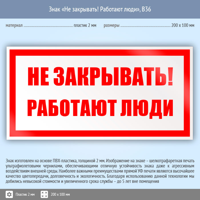 Знак «Не закрывать! Работают люди», B36 (пластик, 200х100 мм) в Великом Новгороде купить