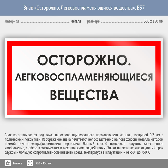Знак «Осторожно. Легковоспламеняющиеся вещества», B37 (металл, 300х150 мм) в Великом Новгороде купить
