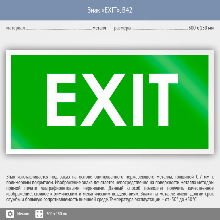 Знак «EXIT», B42 (металл, 300х150 мм) в Великом Новгороде купить