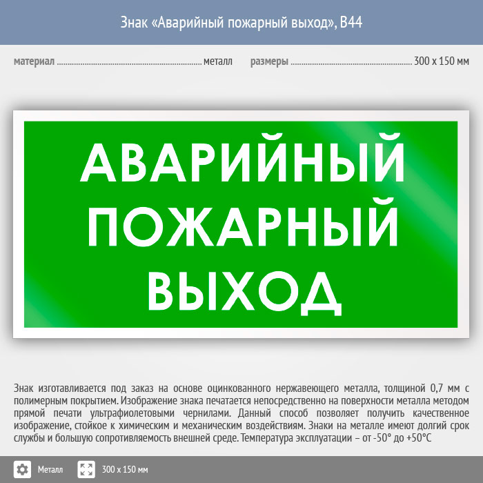 Знак «Аварийный пожарный выход», B44 (металл, 300х150 мм) в Великом Новгороде купить