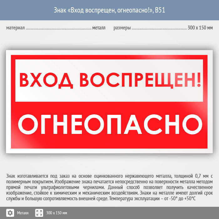 Знак «Вход воспрещен, огнеопасно!», B51 (металл, 300х150 мм) в Великом Новгороде купить