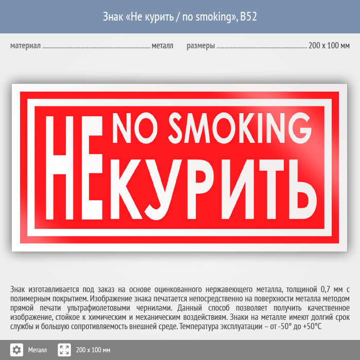 Знак «Не курить / no smoking», B52 (металл, 200х100 мм) в Великом Новгороде купить