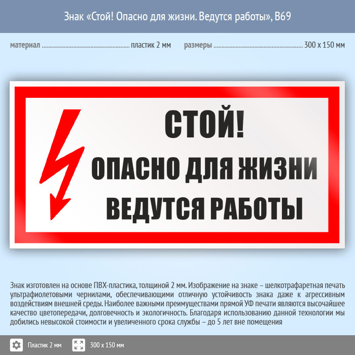 Знак «Стой! Опасно для жизни. Ведутся работы», B69 (пластик, 300х150 мм) в Великом Новгороде купить