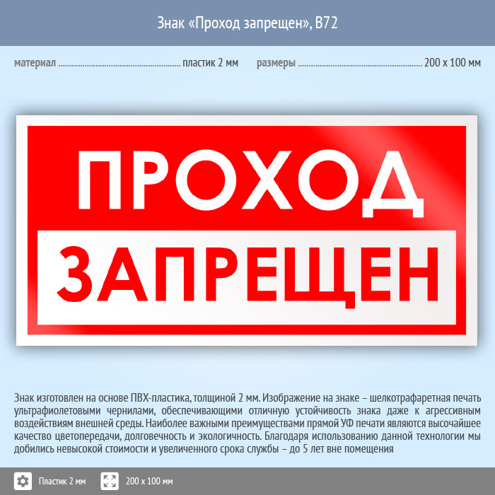 Знак «Проход запрещен», B72 (пластик, 200х100 мм) в Великом Новгороде купить