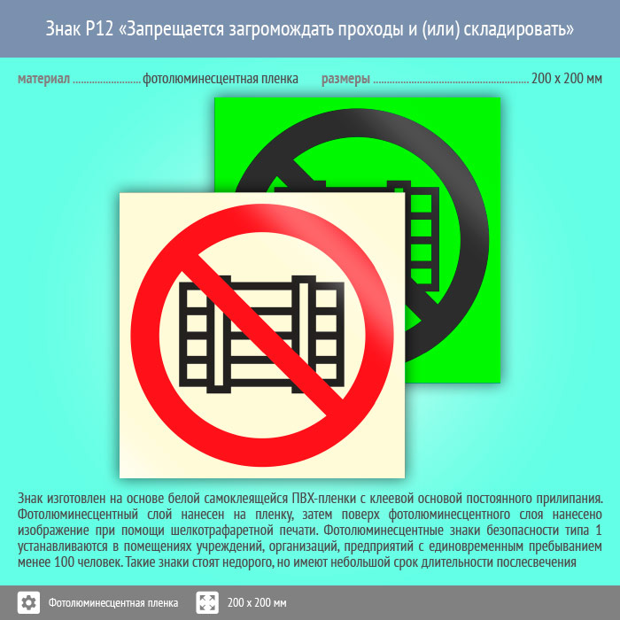 Знак P12 «Запрещается загромождать проходы и (или) складировать» (фотолюминесцентная пленка, 200х200 мм) в Великом Новгороде купить