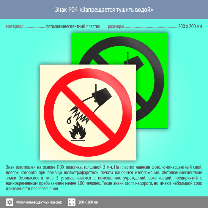Знак P04 «Запрещается тушить водой» (фотолюминесцентный пластик, 200х200 мм) в Великом Новгороде купить
