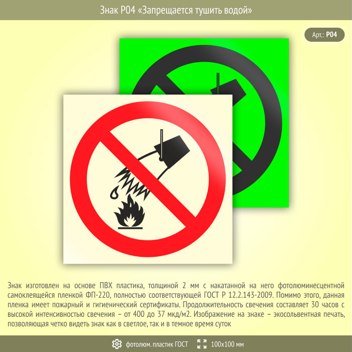 Знак P04 «Запрещается тушить водой» (фотолюминесцентный пластик ГОСТ 34428-2018, 100х100 мм) в Великом Новгороде купить