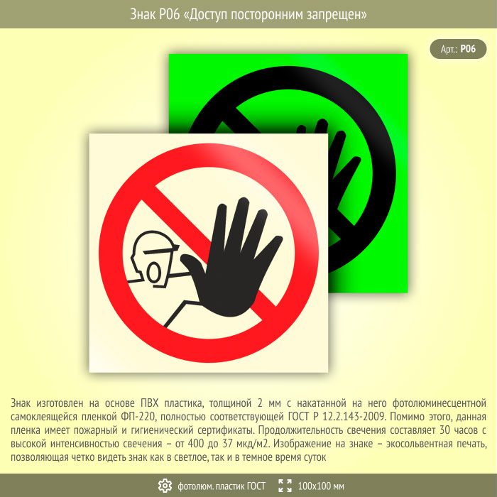 Знак P06 «Доступ посторонним запрещен» (фотолюминесцентный пластик ГОСТ 34428-2018, 100х100 мм) в Великом Новгороде купить