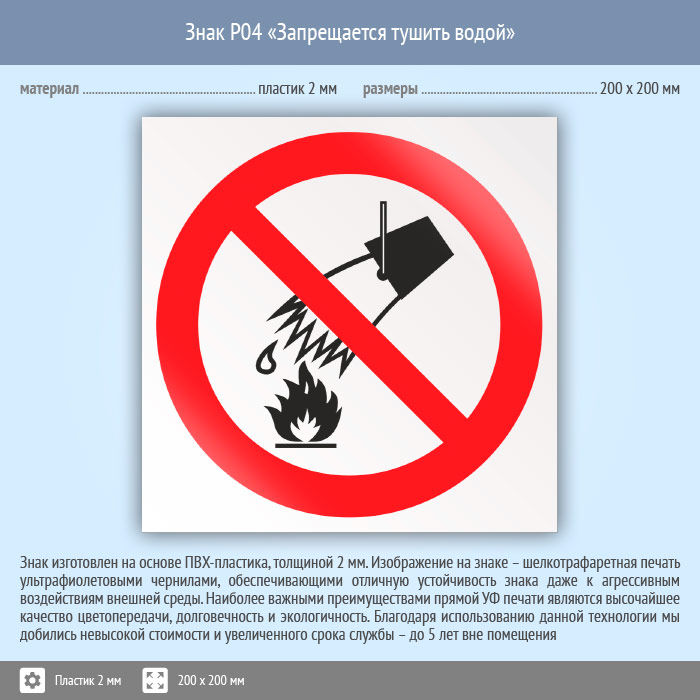 Знак P04 «Запрещается тушить водой» (пластик, 200х200 мм) в Великом Новгороде купить