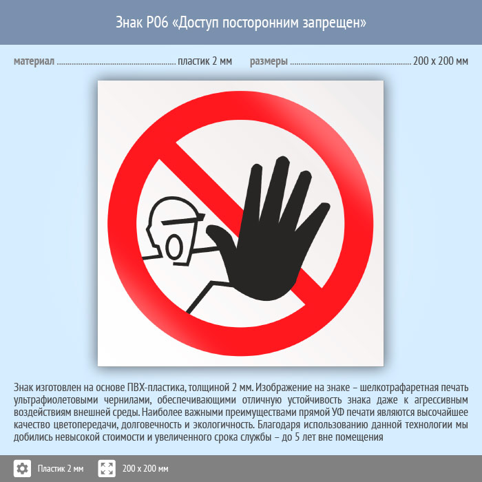 Знак P06 «Доступ посторонним запрещен» (пластик, 200х200 мм) в Великом Новгороде купить