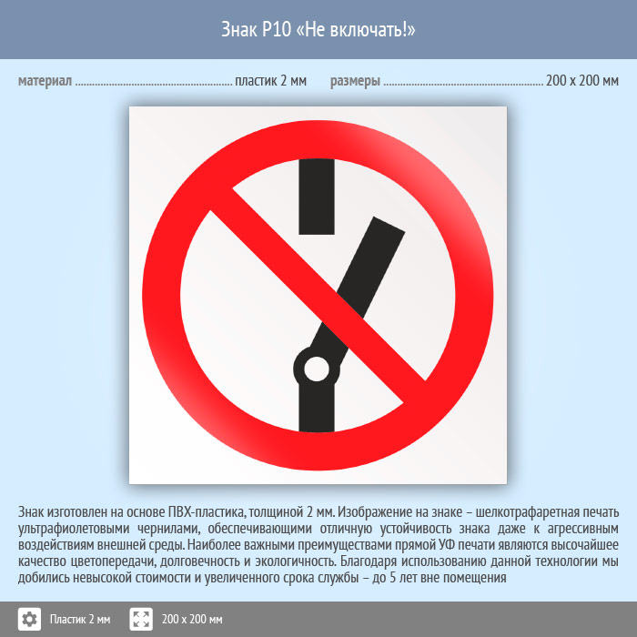 Знак P10 «Не включать!» (пластик, 200х200 мм) в Великом Новгороде купить