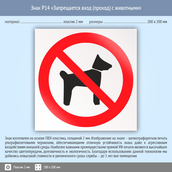 Знак P14 «Запрещается вход (проход) с животными» (пластик, 200х200 мм) в Великом Новгороде купить