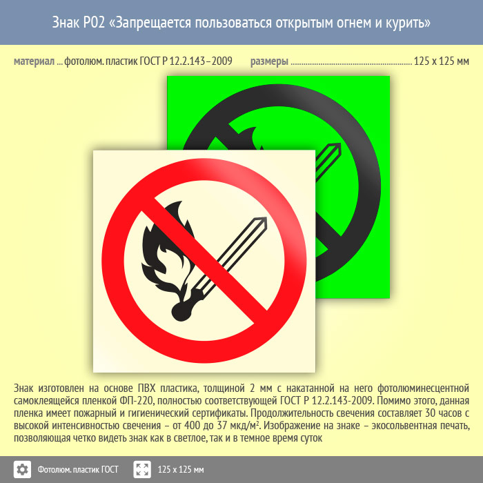 Знак P02 «Запрещается пользоваться открытым огнем и курить» (фотолюминесцентный пластик ГОСТ 34428-2018, 125х125 мм) в Великом Новгороде купить