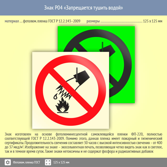 Знак P04 «Запрещается тушить водой» (фотолюминесцентная пленка ГОСТ 34428-2018, 125х125 мм) в Великом Новгороде купить
