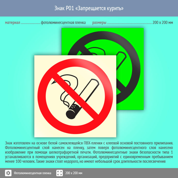 Знак P01 «Запрещается курить» (фотолюминесцентная пленка, 200х200 мм) в Великом Новгороде купить