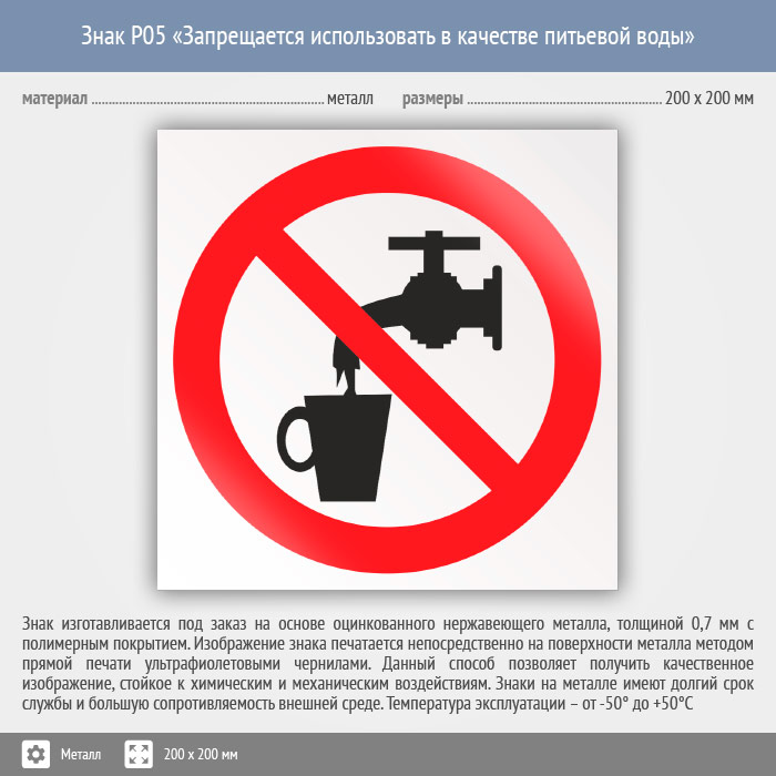 Знак P05 «Запрещается использовать в качестве питьевой воды» (металл, 200х200 мм) в Великом Новгороде купить