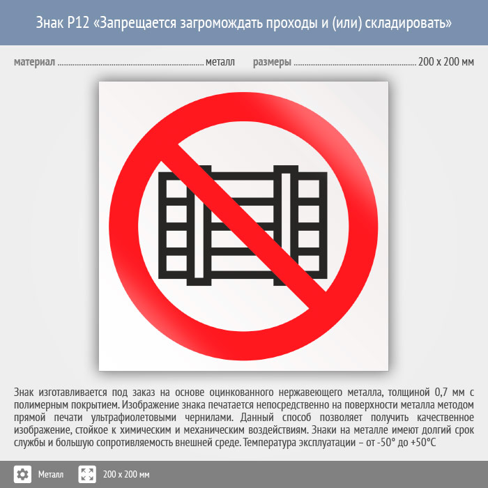 Знак P12 «Запрещается загромождать проходы и (или) складировать» (металл, 200х200 мм) в Великом Новгороде купить
