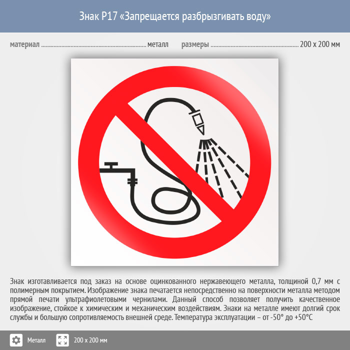 Знак P17 «Запрещается разбрызгивать воду» (металл, 200х200 мм) в Великом Новгороде купить