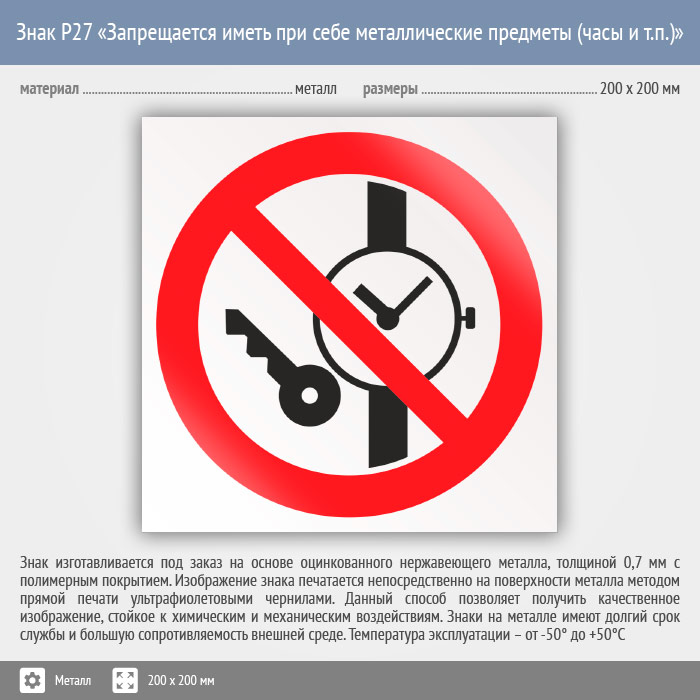Знак P27 «Запрещается иметь при (на) себе металлические предметы (часы и т.п.)» (металл, 200х200 мм) в Великом Новгороде купить