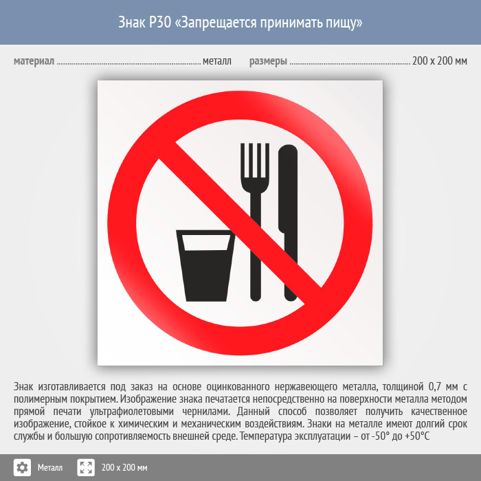 Знак P30 «Запрещается принимать пищу» (металл, 200х200 мм) в Великом Новгороде купить