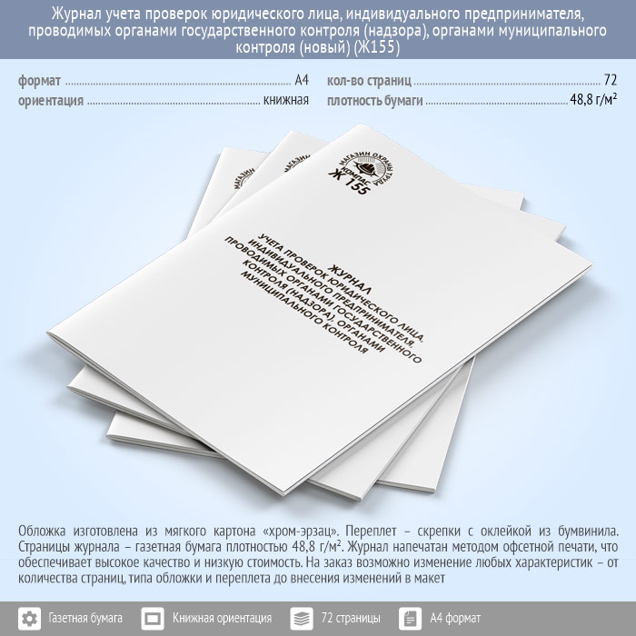 Журнал учета проверок юридического лица, индивидуального предпринимателя, проводимых органами государственного контроля (надзора), органами муниципального контроля (новый) (72 стр., Ж155) в Великом Новгороде купить