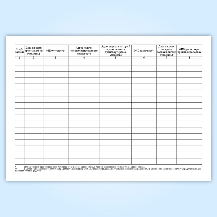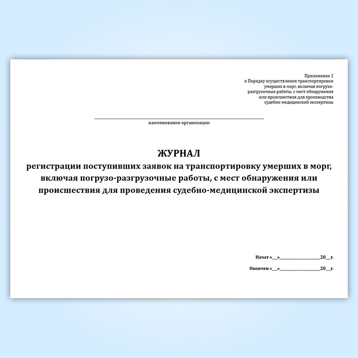 Журнал регистрации поступивших заявок на транспортировку умерших в морг, включая погрузо-разгрузочные работы, с мест обнаружения или происшествия для проведения судебно-медицинской экспертизы в Великом Новгороде купить