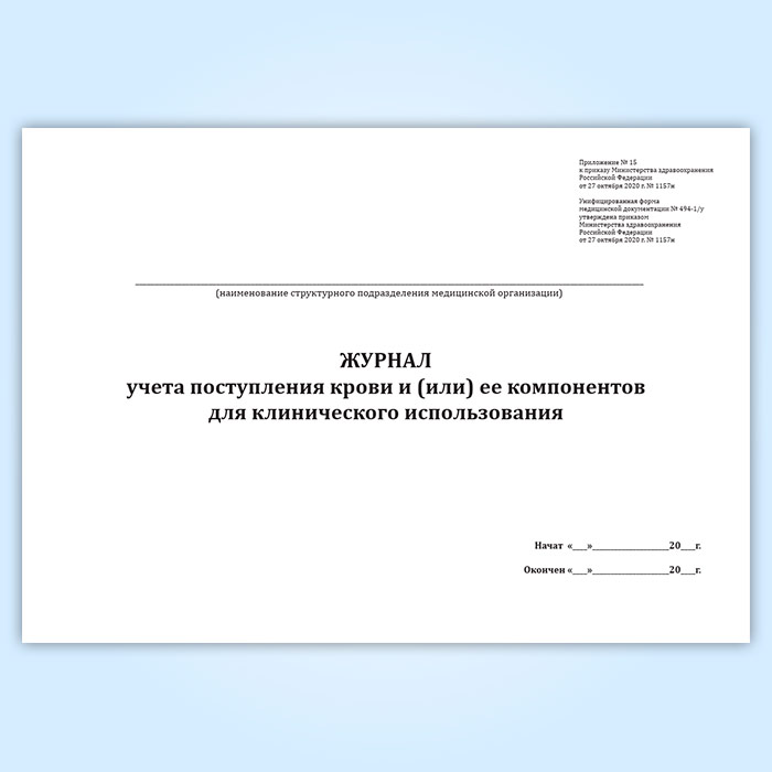 Журнал учета поступления крови и (или) ее компонентов для клинического использования (форма № 494-1/у) в Великом Новгороде купить