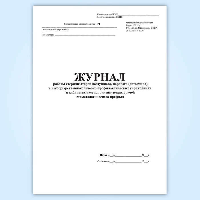 Журнал работы стерилизаторов воздушного, парового (автоклава) в негосударственных лечебно-профилактических учреждениях и кабинетах частнопрактикующих врачей стоматологического профиля (форма 257/у) в Великом Новгороде купить