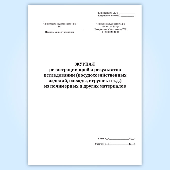 Журнал регистрации проб и результатов исследований (посудохозяйственных изделий, одежды, игрушек и т.д.) из полимерных и других материалов (форма № 338-у) в Великом Новгороде купить