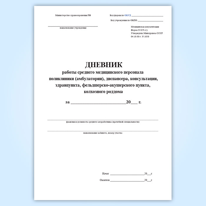 Дневник работы среднего медицинского персонала поликлиники (амбулатории), диспансера, консультации, здравпункта, фельдшерско-акушерского пункта, колхозного роддома (форма 039-1/у) в Великом Новгороде купить