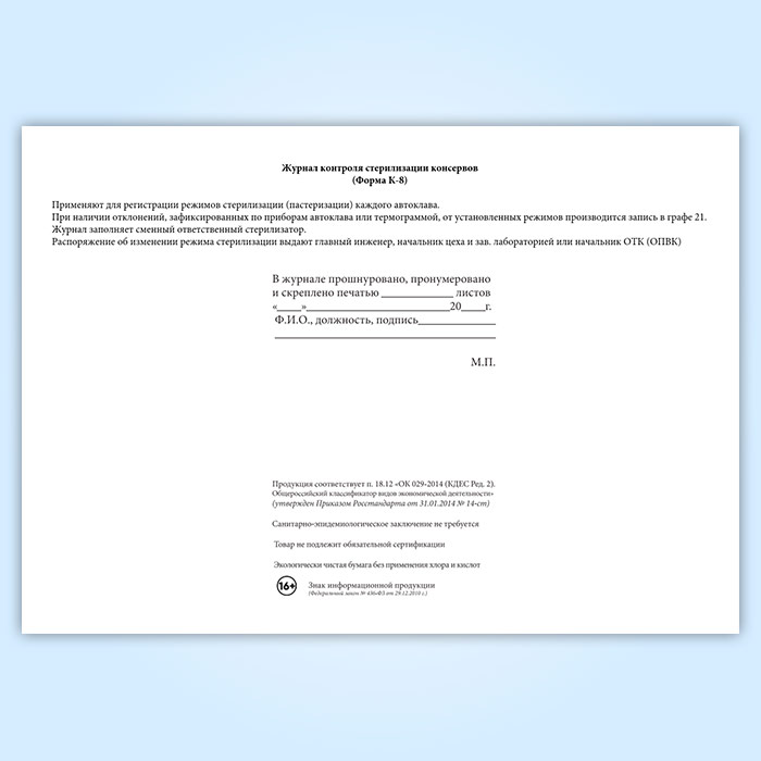 Журнал контроля стерилизации консервов (форма К-8) в Великом Новгороде купить