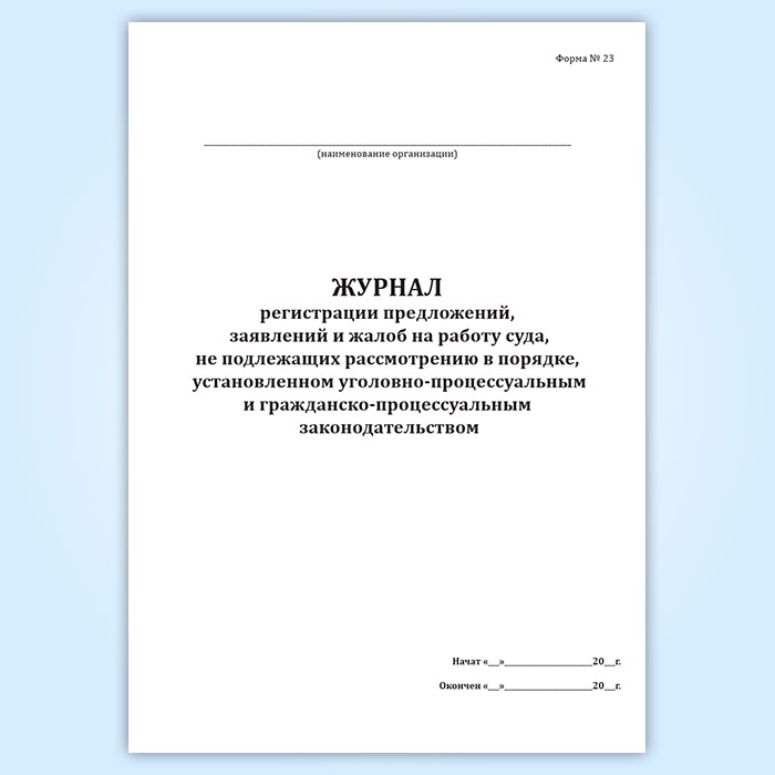 Журнал регистрации предложений, заявлений и жалоб на работу суда, не подлежащих рассмотрению в порядке, установленном уголовно-процессуальным и гражданско-процессуальным законодательством (форма № 23) в Великом Новгороде купить