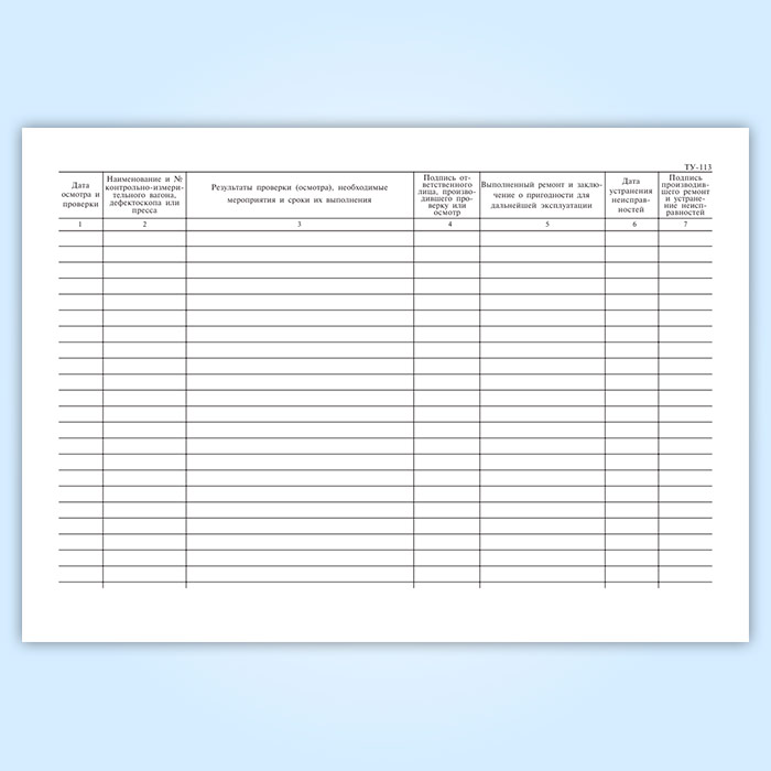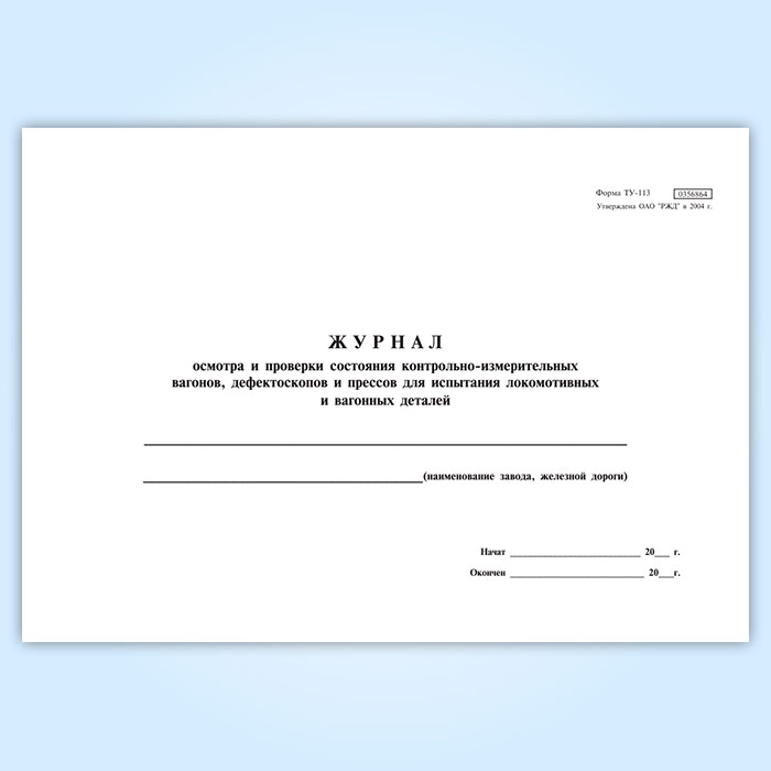 Журнал осмотра и проверки состояния контрольно-измерительных вагонов, дефектоскопов и прессов для испытания локомотивных и вагонных деталей (форма ТУ-113) в Великом Новгороде купить