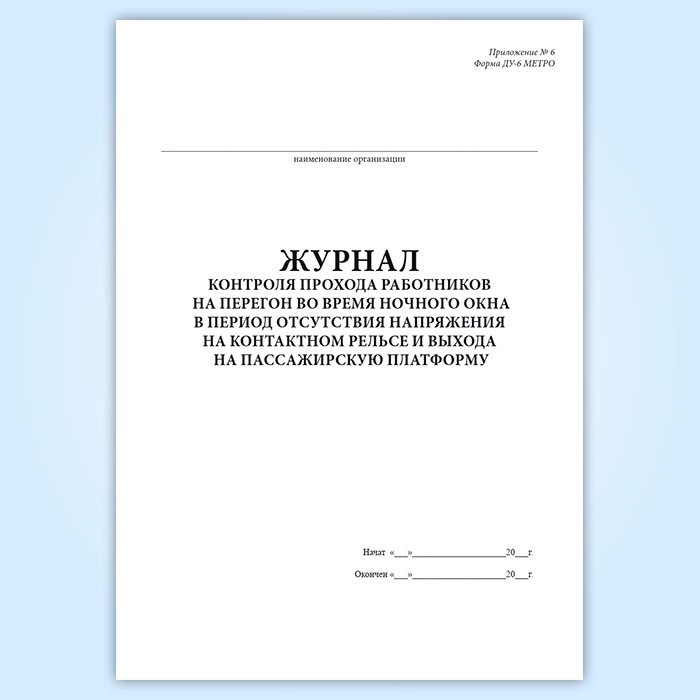 Журнал контроля прохода работников на перегон во время ночного окна в период отсутствия напряжения на контактном рельсе и выхода на пассажирскую платформу (форма ДУ-6 МЕТРО) в Великом Новгороде купить