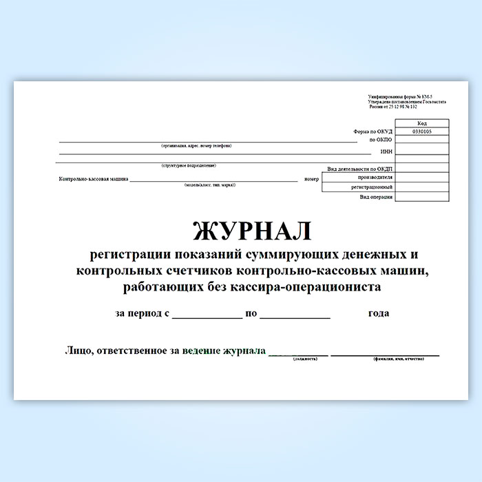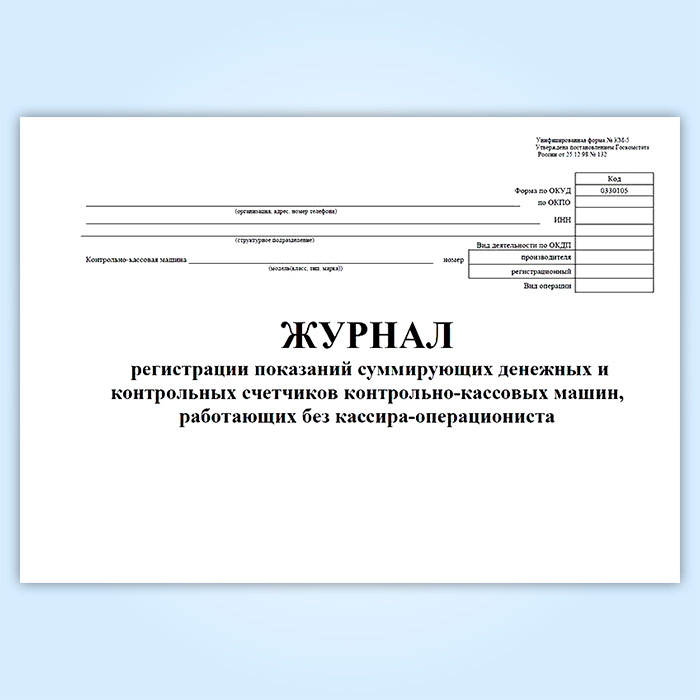 Журнал регистрации показаний суммирующих денежных и контрольных счетчиков контрольно-кассовых машин, работающих без кассира-операциониста (форма КМ-5) в Великом Новгороде купить