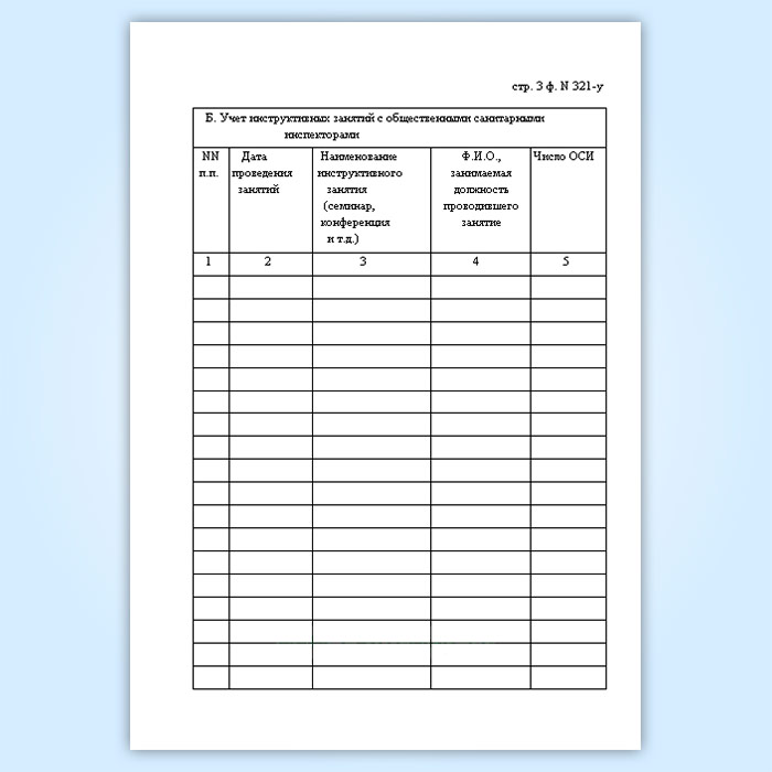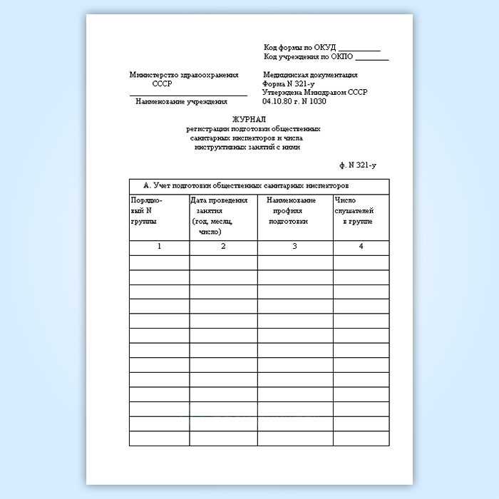 Журнал регистрации подготовки общественных санитарных инспекторов и числа инструктивных занятий с ними (форма № 321-у) в Великом Новгороде купить
