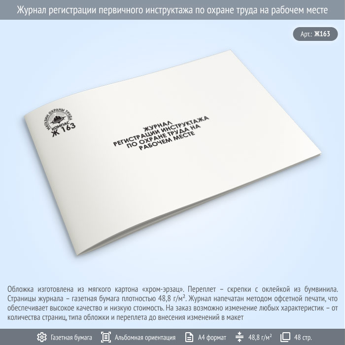 Журнал регистрации первичного инструктажа по охране труда на рабочем месте (Ж163, 48 стр.) в Великом Новгороде купить