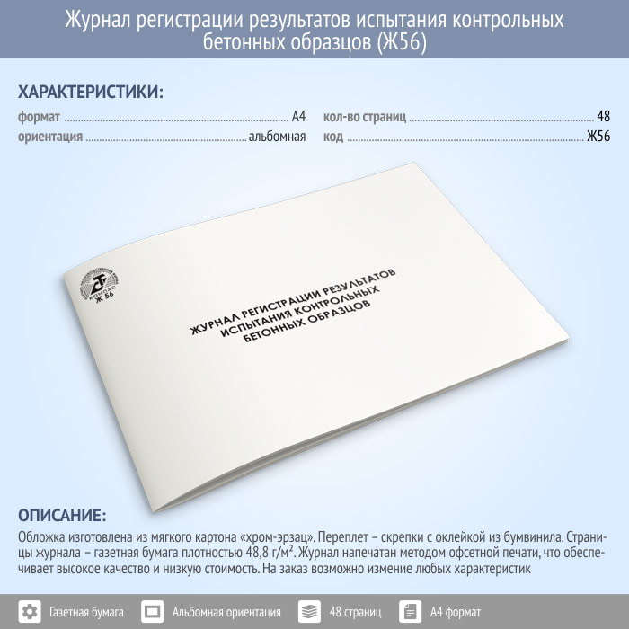 Журнал регистрации результатов испытания контрольных бетонных образцов (48 стр., Ж56) в Великом Новгороде купить